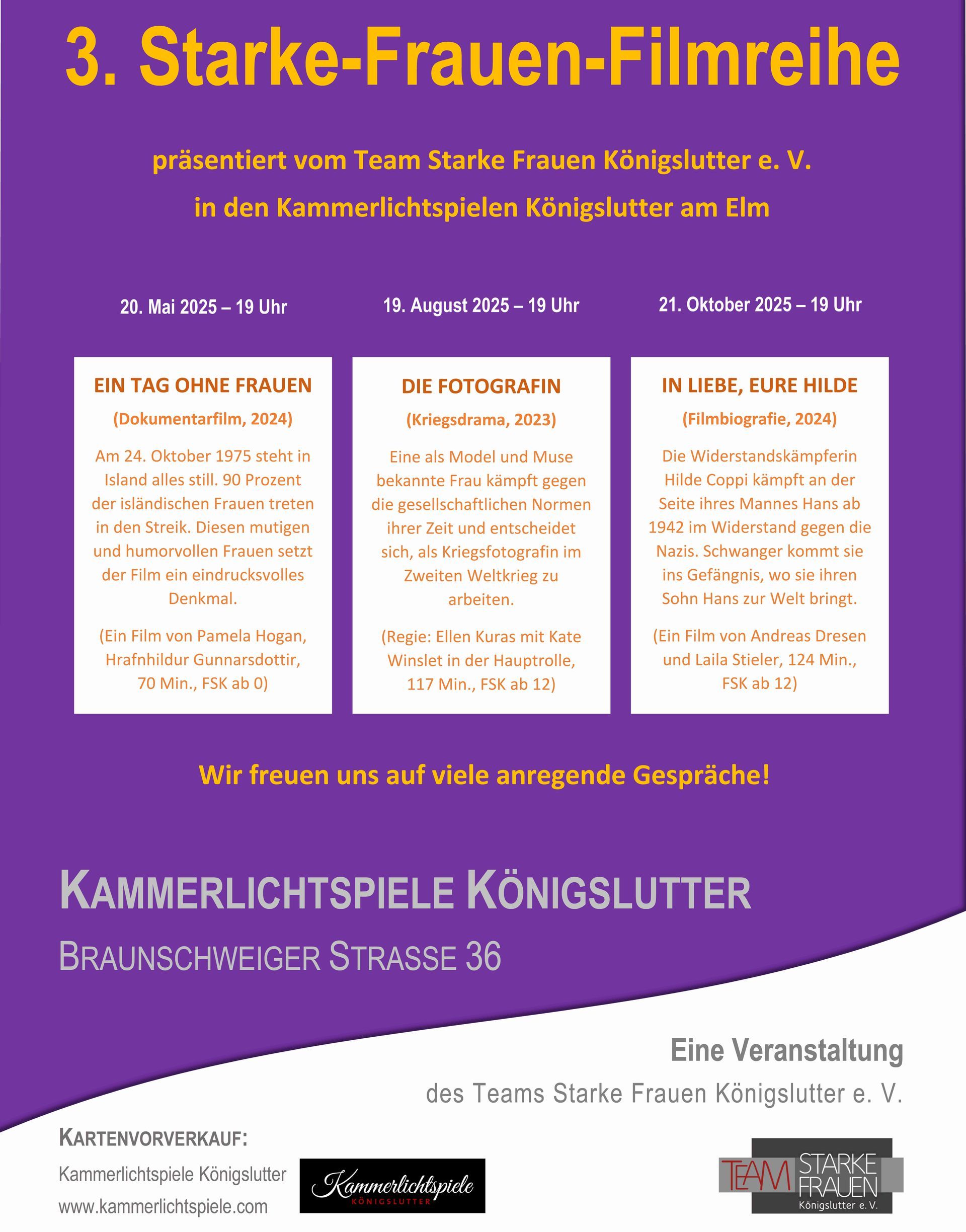 Die 3. Starke-Frauen-Filmreihe des Teams Starke Frauen Königslutter e. V. wird am Dienstag, dem 21. Oktober um 19 Uhr in den Kammerlichtspielen Königslutter fortgesetzt mit dem Film "In Liebe, Eure Hilde" (2024).